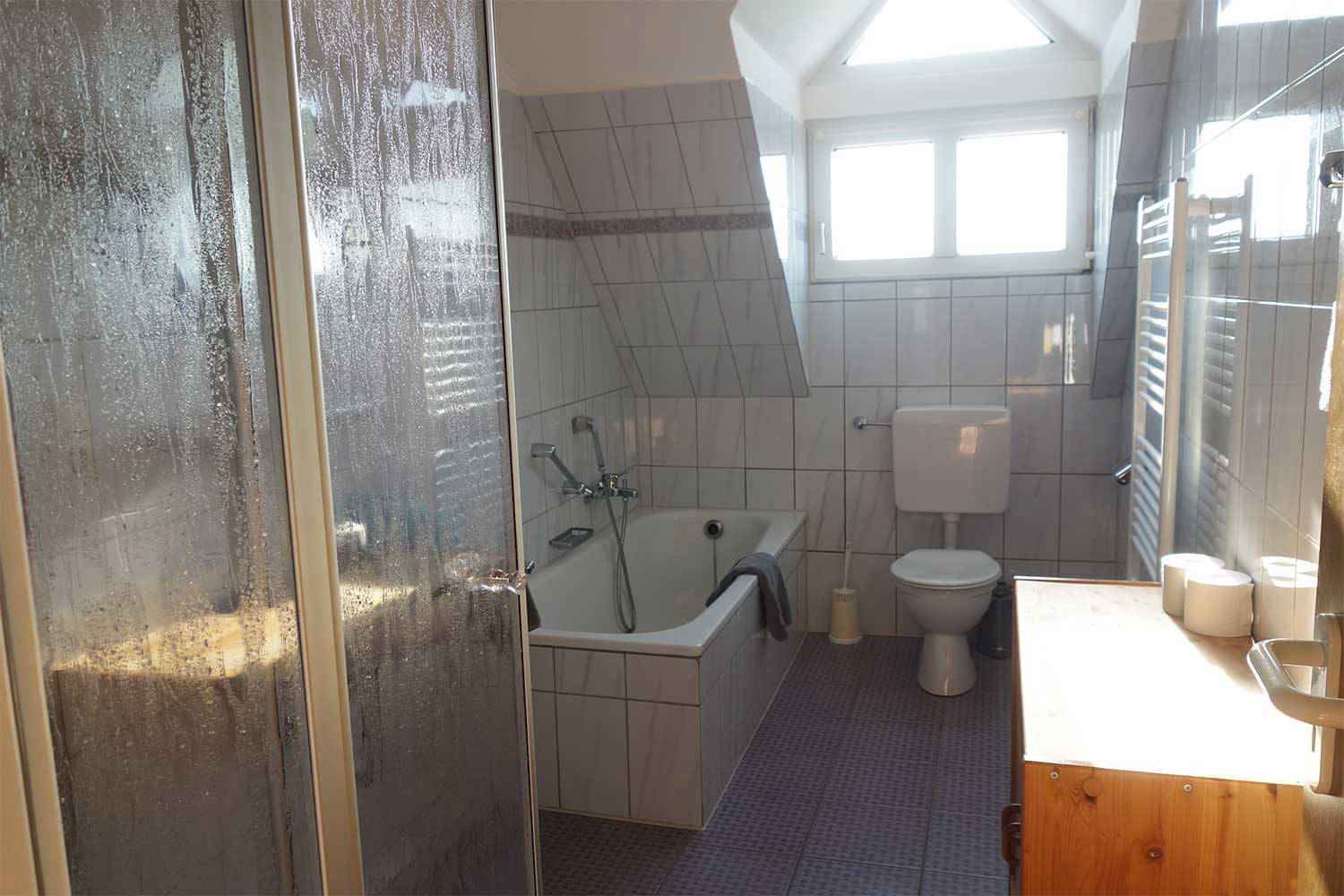- Im Badezimmer gibt es sowohl eine Dusche als auch eine Badewanne