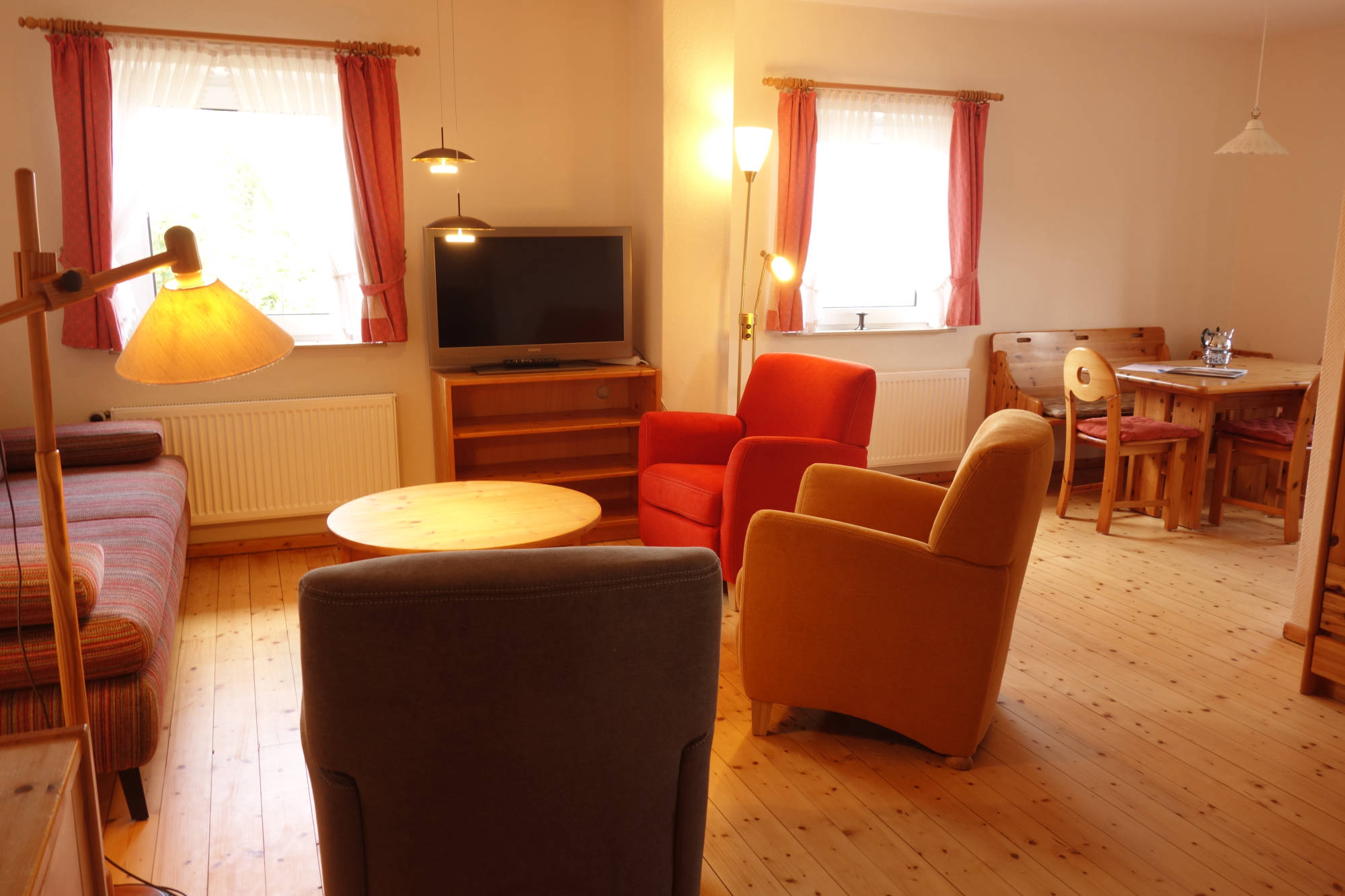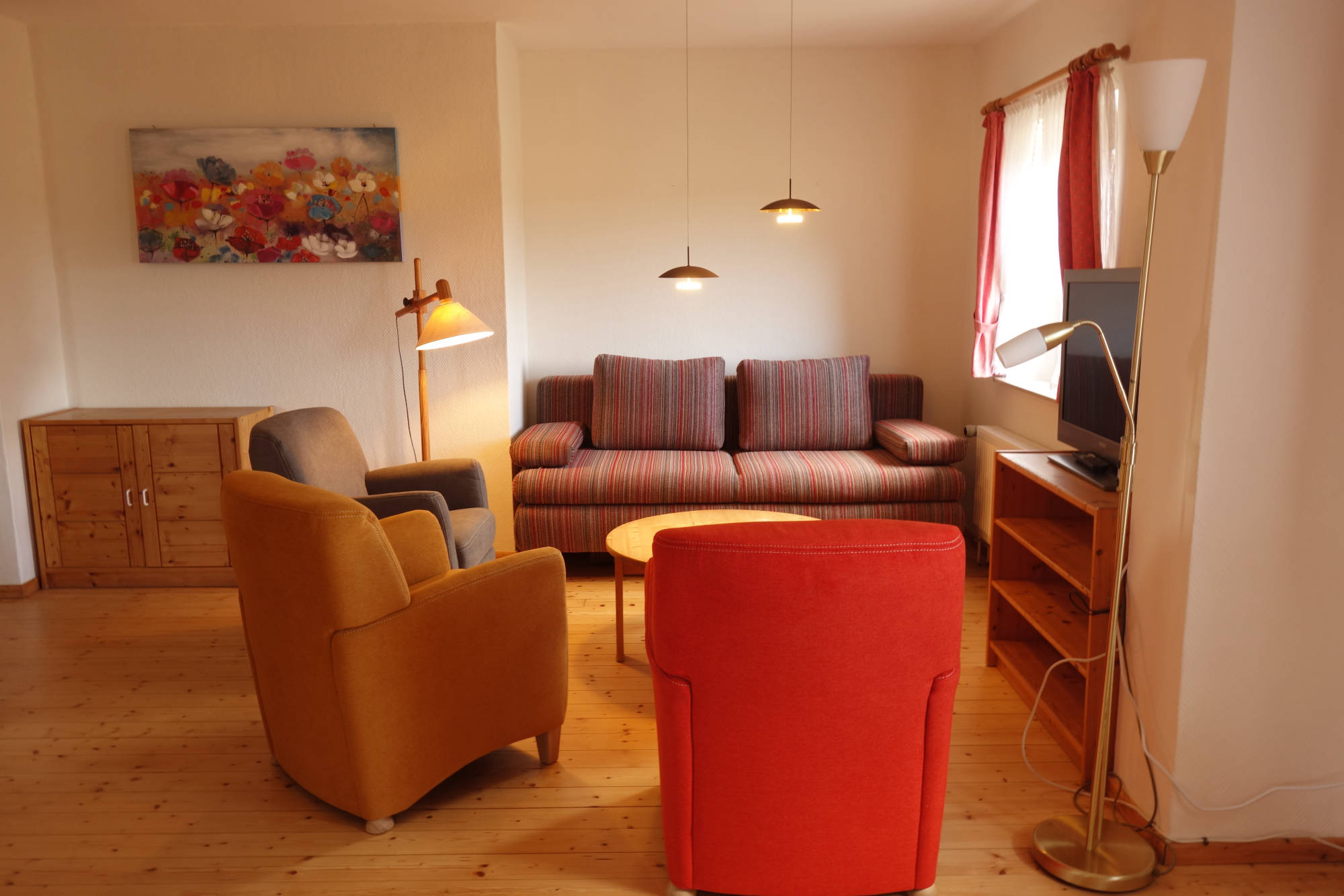 Die Wohnung Kunterbunt ist eine gemütliche Wohnung für die ganze Familie. Unsere Wohnung 2 ist im Erdgeschoss gelegen und Sie können aus den Fenstern den Blick auf die idyllischen Baltrumer Dünen genießen. Die Wohnung verfügt über ein Schlafzimmer mit Doppelbett und einem grossen Kleiderschrank sowie ein Schlafzimmer mit Etagenbett, ein gemütliches, modernes Wohnzimmer (TV-Flachbildschirm), eine integrierte, voll eingerichtete Küche und ein Badezimmer. Mit einer Wohnfläche von ca 64qm ist sie für 4 Personen ausgelegt. Ein Zustellbett im Kinderzimmer und ein Schlafsofa im Wohnzimmer bieten drei zusätzliche Schlafplätze. Der Wohn- und Essbereich ist mit einem Holzfußboden und einem Esstisch für 6 Personen ausgestattert.